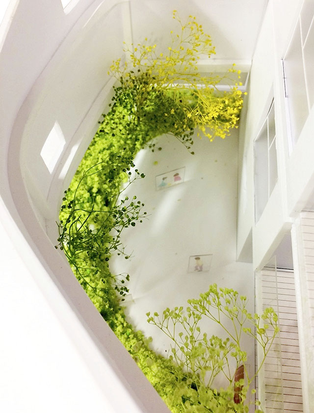 皮膜に設けられた大小様々な開口部からは、たくさんの光と風が取り込まれ、わずかに内外の様子が感じることができる適度な距離感を生み出すことが意図されている。