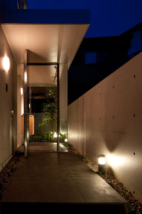 斜面地の高低差を生かし、半地下空間を備えた3階構成としながら、建物全体としては低く設定しボリューム感を抑えることで周辺環境に配慮している。