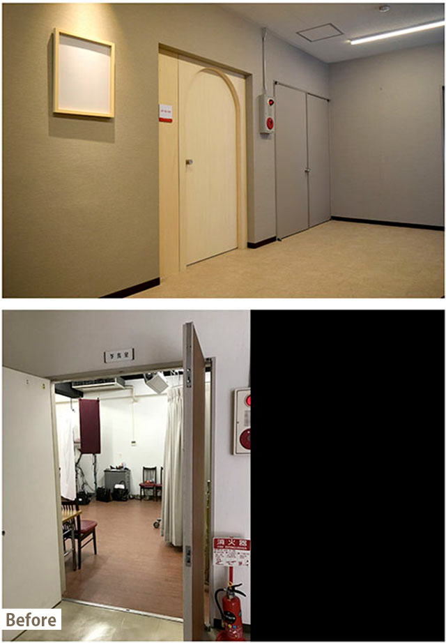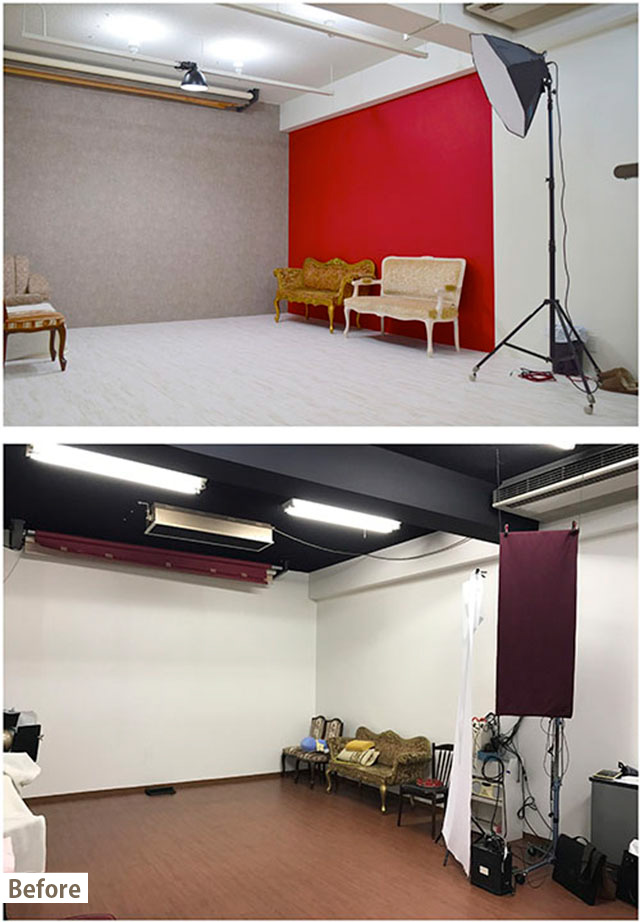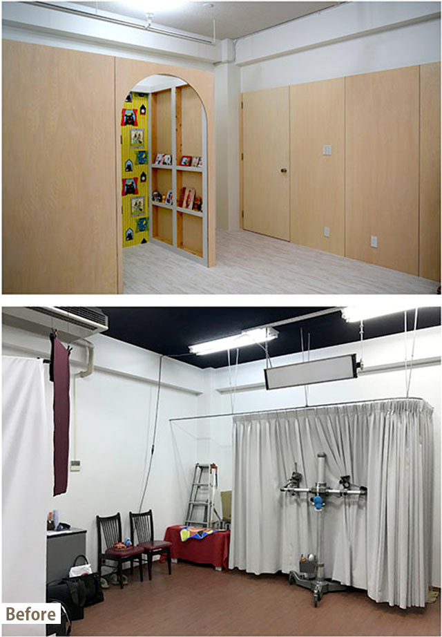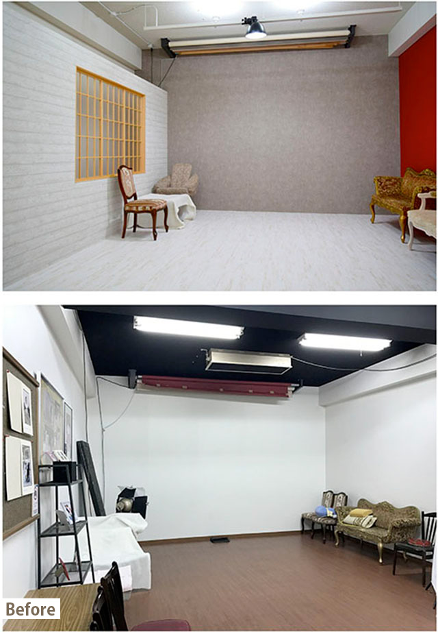 老朽化した写真館を明るく、そして様々な撮影スタイルに臨機応変に対応できるよう多様な背景面を用意した。